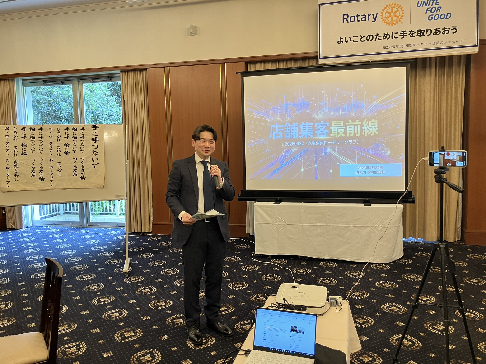 2026年4月22日に4月第3例会を開催しました。今回の例会アワーは、プログラム委員会の石束貴委員長が、「アクアコインキャンペーン」と「店舗集客最前線」というテーマで卓話を行いました。